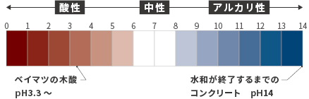 いろいろな樹種の木酸の酸性度は「木材利用の化学」の木材のpH項目にまとめられています。木造住宅の梁に多く使用されるベイマツの木酸のpHは3.3~と酸性度が高く、接合金物を早期に腐食します。また、高温乾燥木材の木酸の酸性度が乾燥前と比べて高くなる傾向にあることも知られてきています。